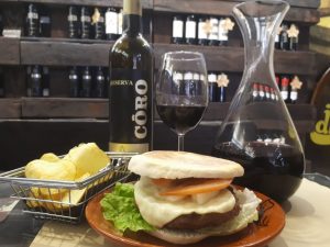 A degustação foi acompanhada por um hambúrguer de Angus com sabor bem forte. A estrutura do vinho trazida pela Cabernet Sauvignon segurou bem a comida, e os aromas e sabores da Syrah e da Alicante harmonizaram bem com a carne.