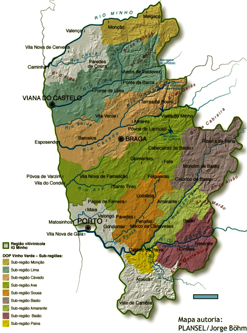 Mapa região dos vinhos verdes e sub-regiões (adaptação). Baixe conteúdo completo da CVRVV aqui. Veja outros mapas de regiões vinícolas de Portugal aqui.